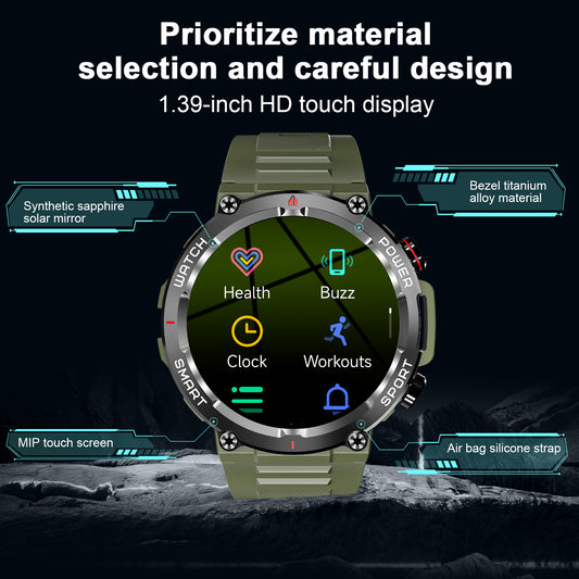 IOWODO W50PRO Military Smartwatch: 30-Day Battery, 1.45" Screen, Bluetooth Call, Flashlight, Compass, 120 Sports Modes, IP68 Waterproof, Green