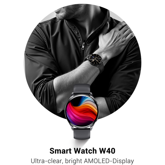 IOWODO W40 Smart Watch with AMOLED Screen, Bluetooth Call, 7-Day Battery, 110+ Sports Modes, Heart Rate/SpO2 Monitor, IP68 Waterproof (Round Dial), Black