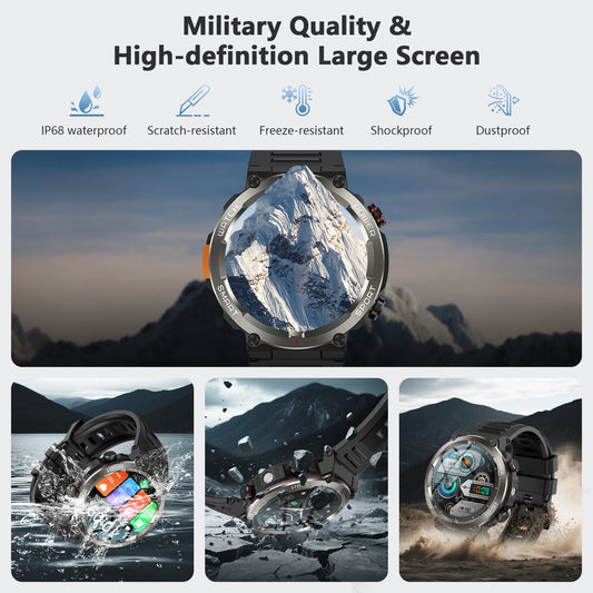 IOWODO W50 Military Smartwatch: Bluetooth Calls, 1.39" HD Screen, 100+ Sports Modes, Heart Rate/SpO2/Sleep Monitor, 7-Day Battery, IP68 (2 Straps),Black