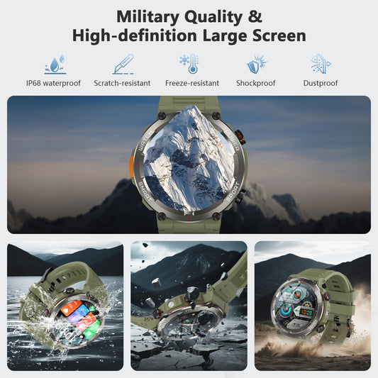 IOWODO W50 Military Smartwatch: Bluetooth Calls, 1.39" HD Screen, 100+ Sports Modes, Heart Rate/SpO2/Sleep Monitor, 7-Day Battery, IP68 (2 Straps),Green