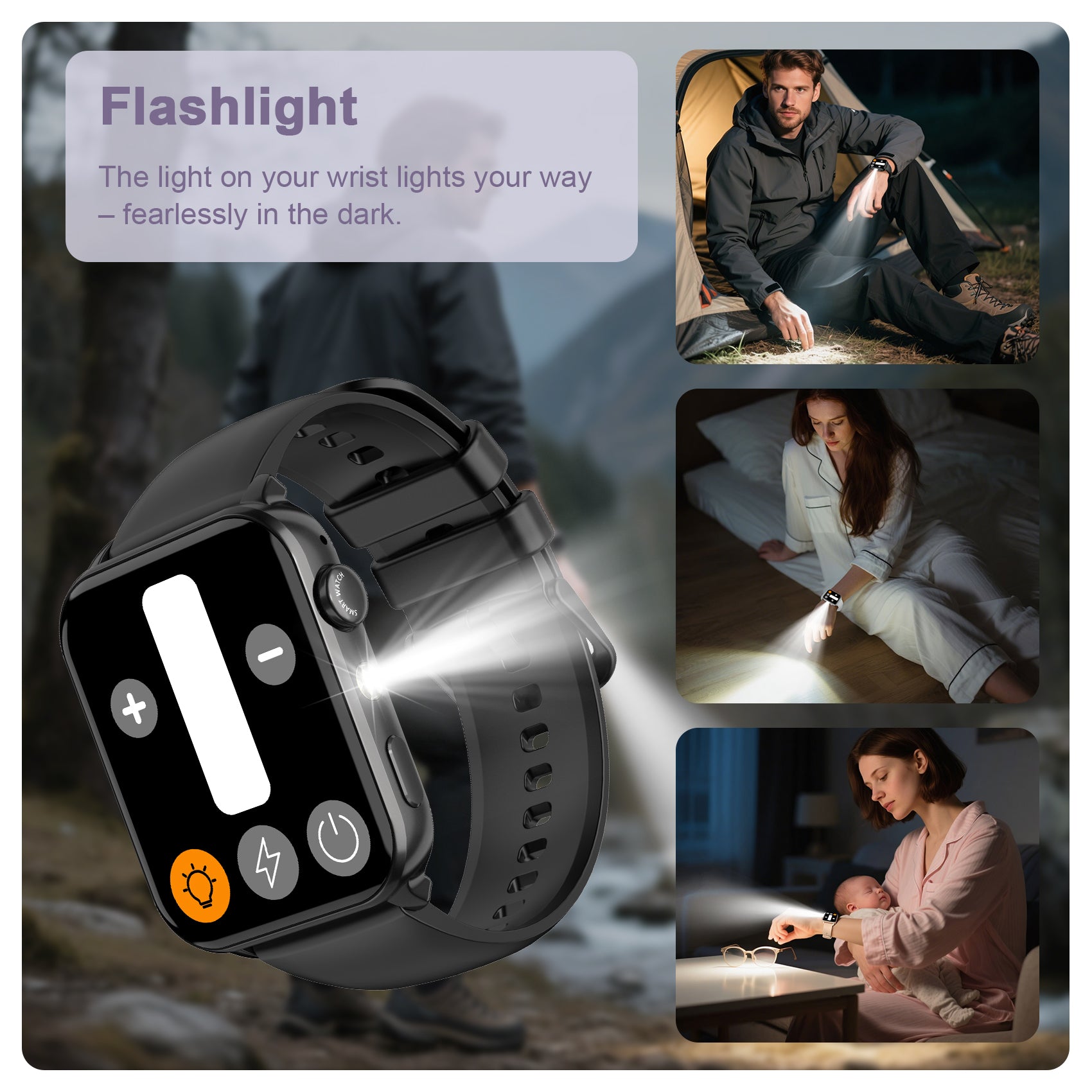 Features an LED flashlight, notifications (WhatsApp, SMS, social apps), music control, weather info, alarms, calculator, games, and more.