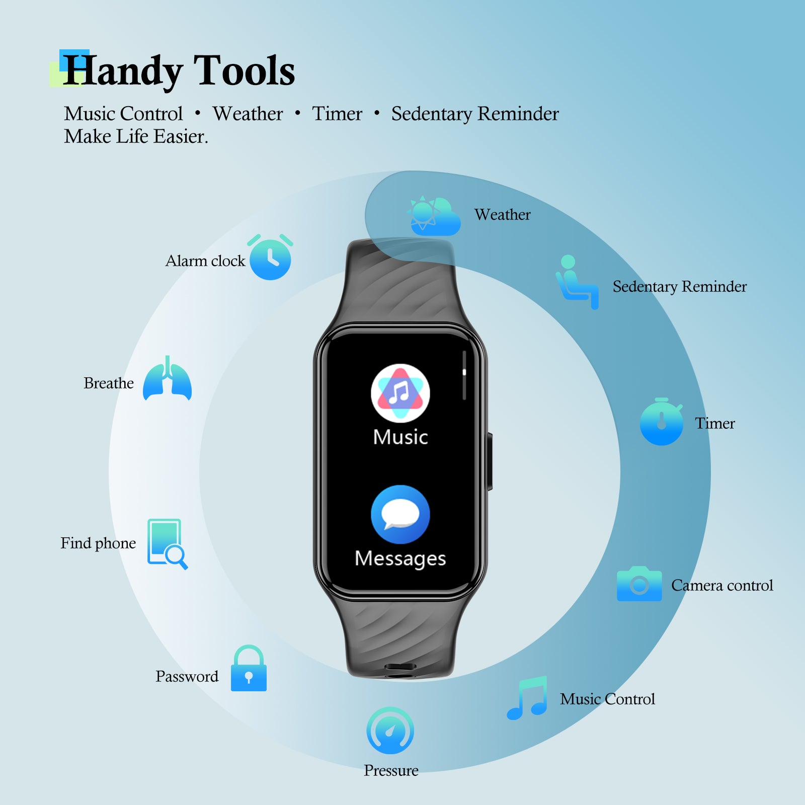 Never miss important alerts from WhatsApp, Facebook, Instagram, SMS, and calls. Additional features include music control, camera shutter control, weather forecast, sedentary reminders, alarm clock, stopwatch, timer, and fun games.