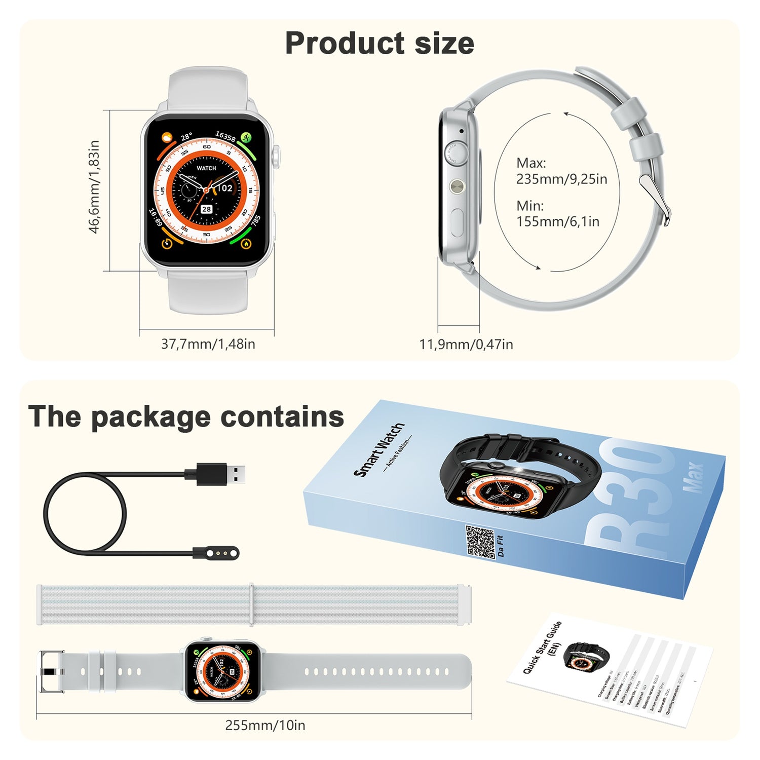 1 x R30MAX Smartwatch (with pre-attached Silicone Strap), 1 x Additional Digital Strap, 1 x USB Charging Cable, 1 x User Manual.